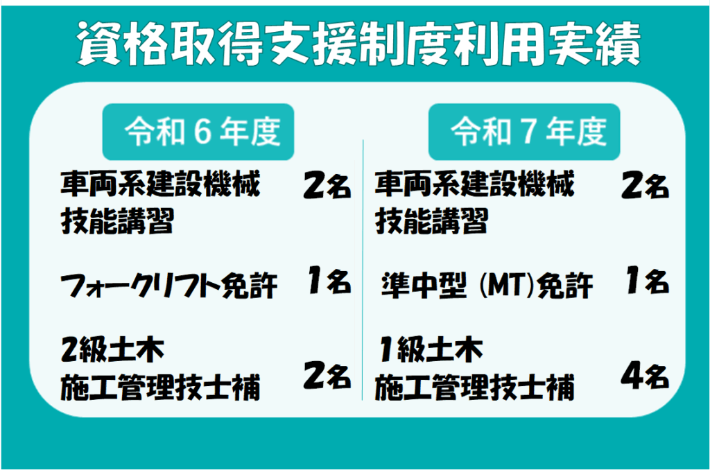 資格取得支援制度 利用実績大公開!By editor / 2026年1月12日 こんにちは! 岡山市南区で土木工事を行っている坂手建設株式会社です。 坂手建設では、重機の資格を勤務時間中に全額会社負担で取得することが可能です。 働きながらスキルアップを目指せる環境が整っています。 今回は、直近2年度の制度利用実績をご紹介します。 働きながらのステップアップイメージです。 希望者は、作業員から重機オペレータも目指せます! 少しでも興味を持っていただけた方は、ぜひ求人情報もご覧ください。