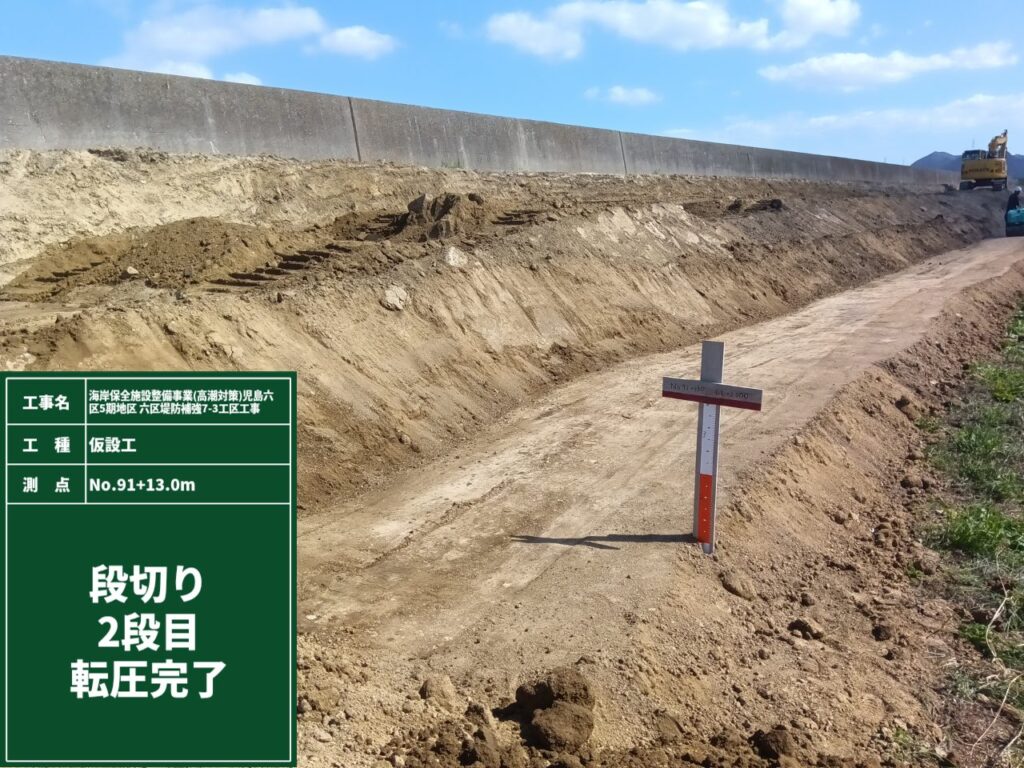 現在は、仮設事務所の設置も終わり、「段切り」→「転圧」の作業に入っています。