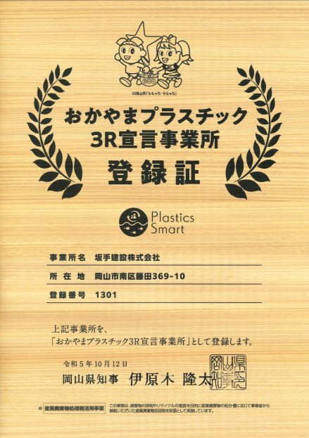 坂手建設は、おかやまプラスチック3R宣言事業所として認定されています。